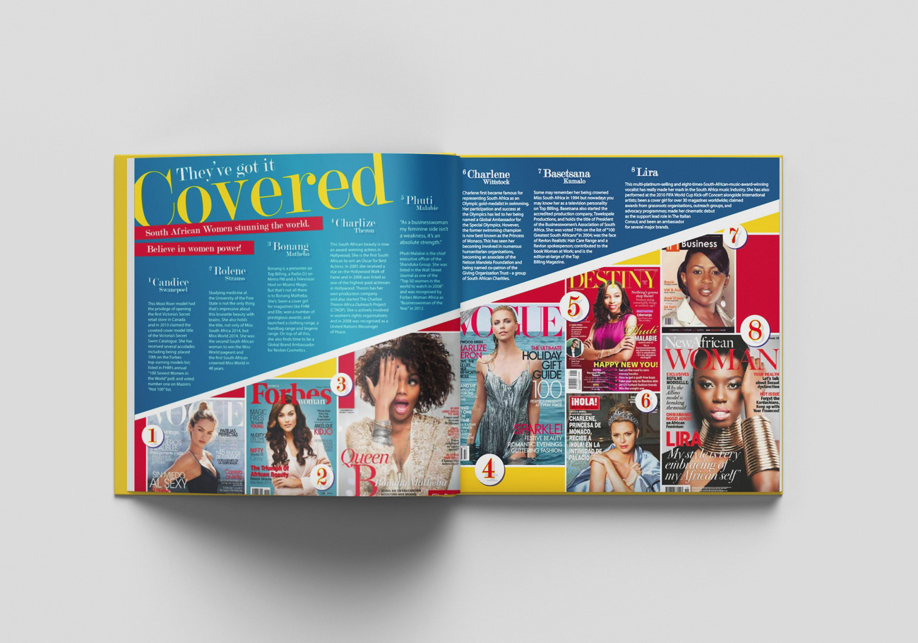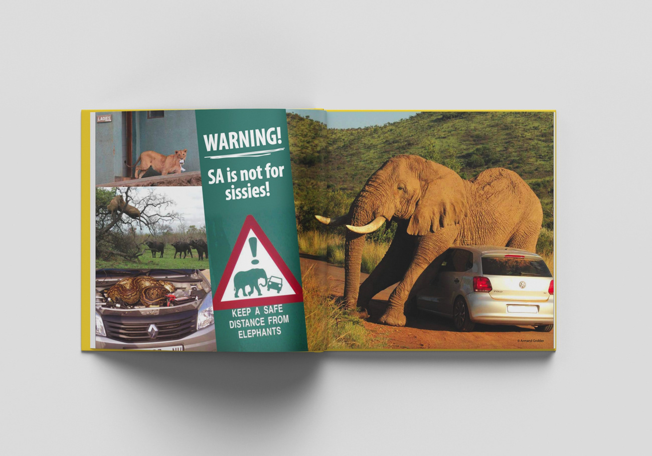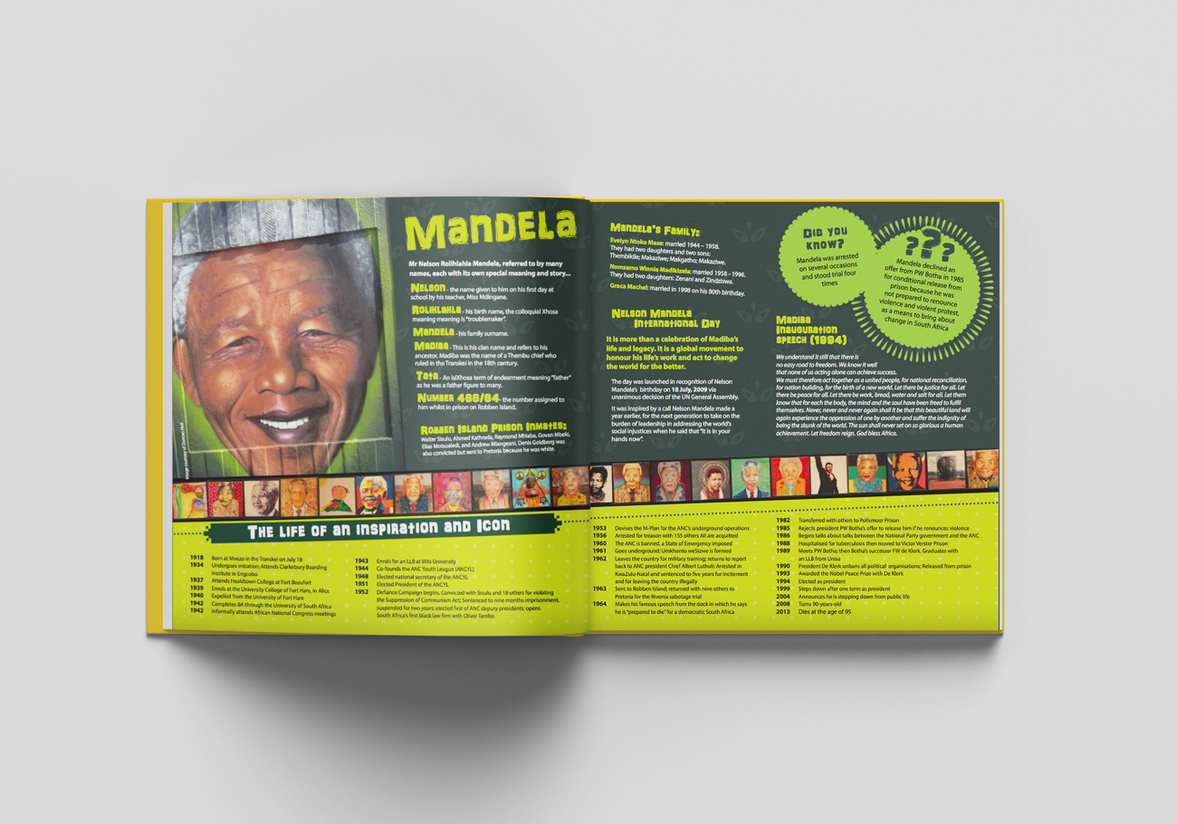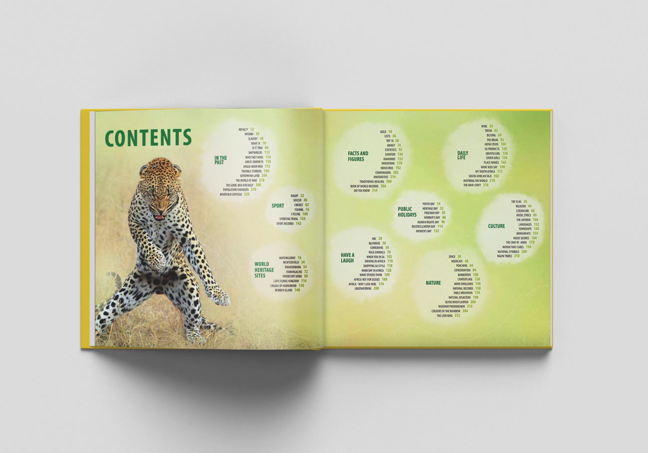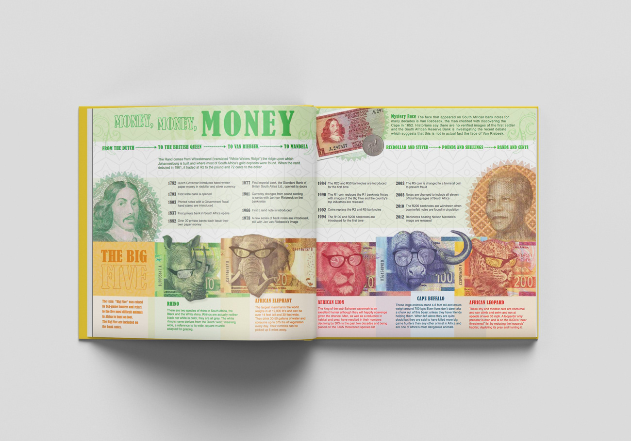 The first in a series of two books for kids, detailing South Africa. It is filled with fun facts, so the brief was to gear it to kids with short blurbs, lots of color and fun graphics.